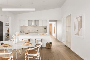 Start with the classic white benchtop, as it works perfectly with the Hamptons theme. Introduce a faint grey spec or marble vein for a more sophisticated look.