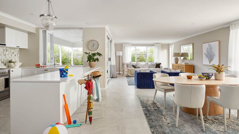 The heart of the home is a spacious kitchen with 40mm Zenith Surfaces benchtops, premium Smeg appliances, and a large walk-in pantry, flowing directly to the open-plan living and dining area and onto a generous alfresco.