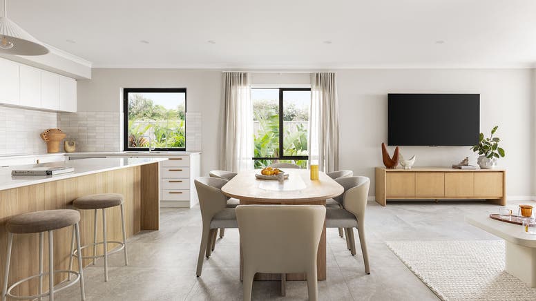 The open-plan living and dining zone is designed to bring everyone together, with a centrally located kitchen that features a handy walk-in pantry for effortless entertaining.