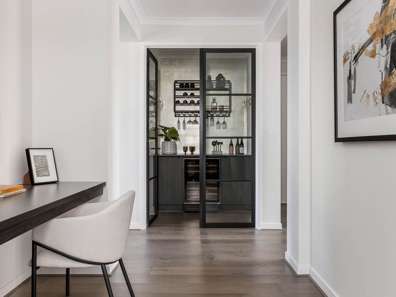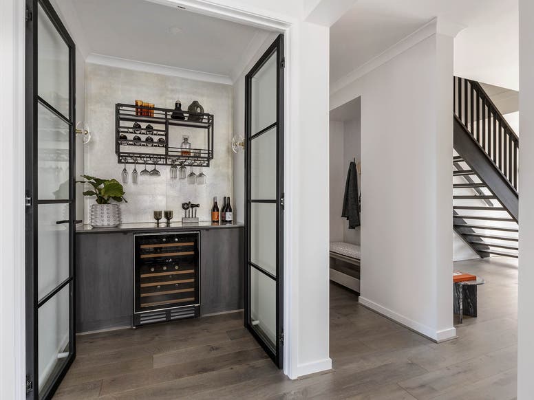 The Allegra 442-D48 showcasing the Berlize facade in Aintree includes feature cabinetry to the mud room, walk in robe, dressing & cloak fit outs, brushed carbon tapware throughout, Smeg stainless steel oven with black glass, electric fireplace in living, freestanding bath in the ensuite and a study fit out.