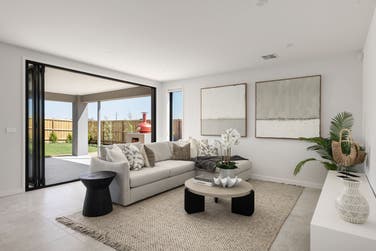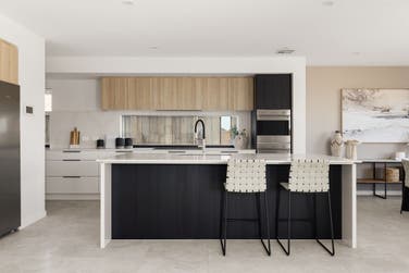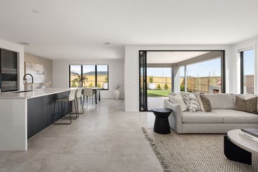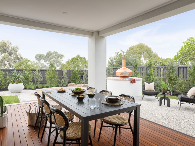 The Vogue 34 featuring the Bronte façade at Lara showcases brushed nickel tapwear, pivot entry door, wrought iron balustrade on staircase, increased height to aluminium stacker doors to alfresco and 900mm stainless steel appliances.