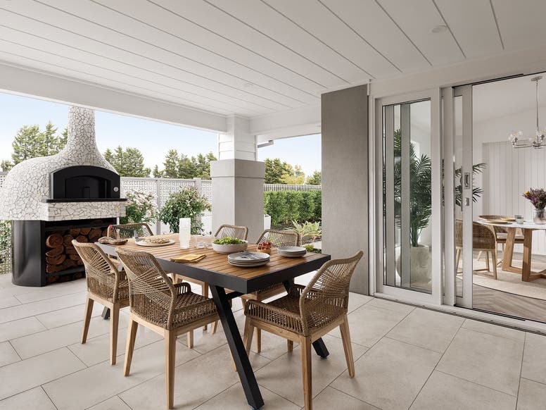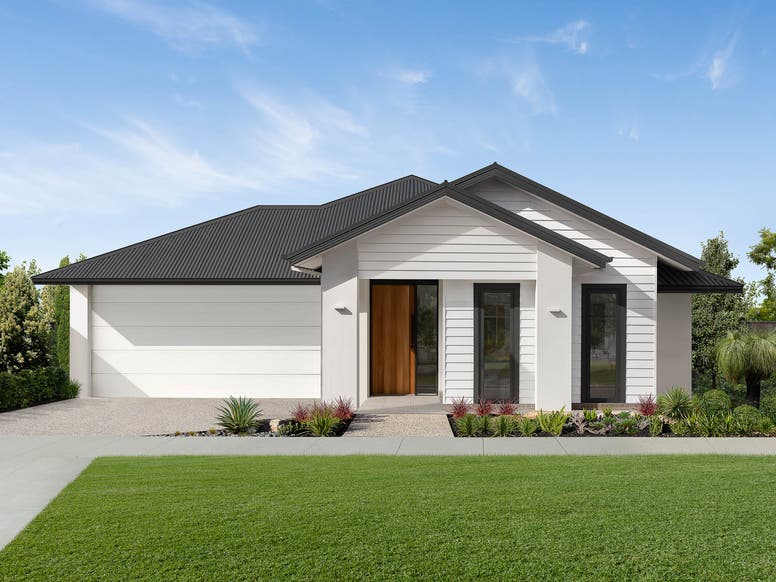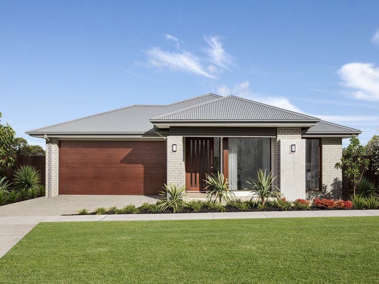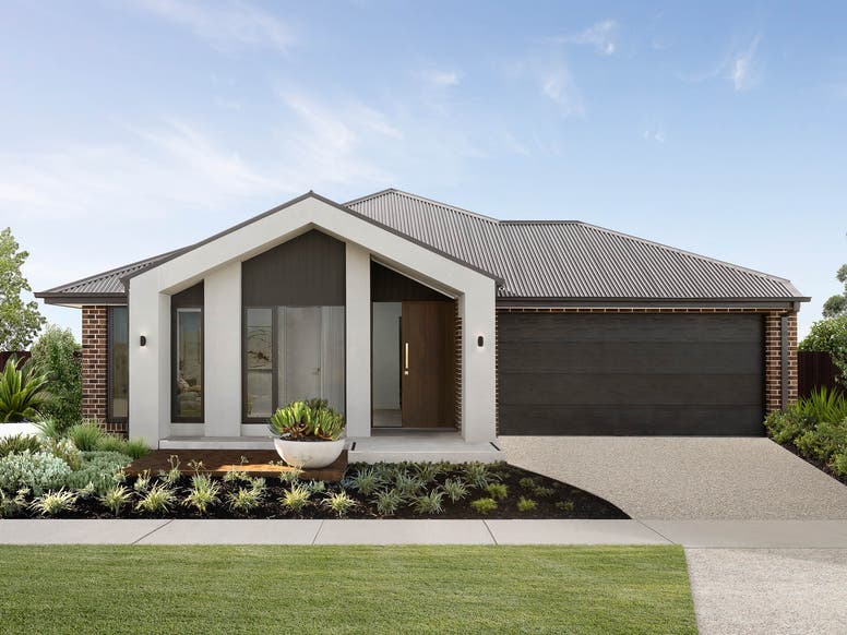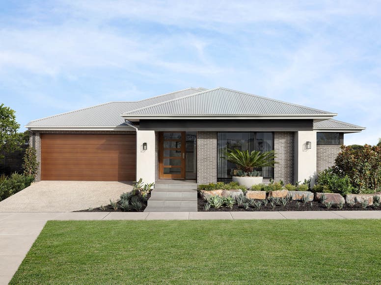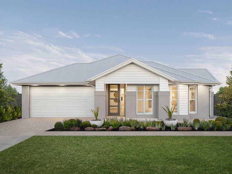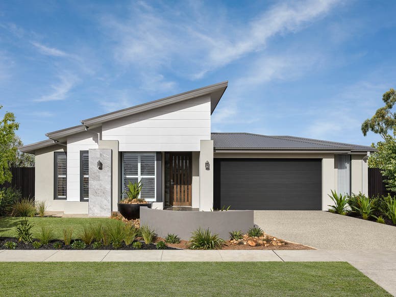 The Carmelle 25 with Ridge façade in Mount Duneed showcases a grand alfresco, raked ceiling, picture window to dining/alfresco, dressing fitout and bi-fold door to alfresco .