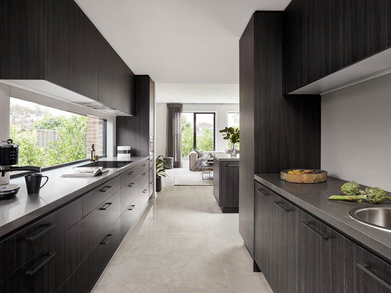 The Montessa 43 with Darlington façade in Berwick showcases 2m high windows (Darlington façade only), classic low profile concrete roof tiles, extended butler's pantry and kitchen fitout, feature dropped ceiling to kitchen, Vic ash staircase with glass balustrade, powder room 1, 2 & 3 with 40mm stone benchtop, aluminium bi-fold doors to alfresco and gas log fireplace to living.