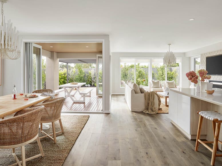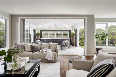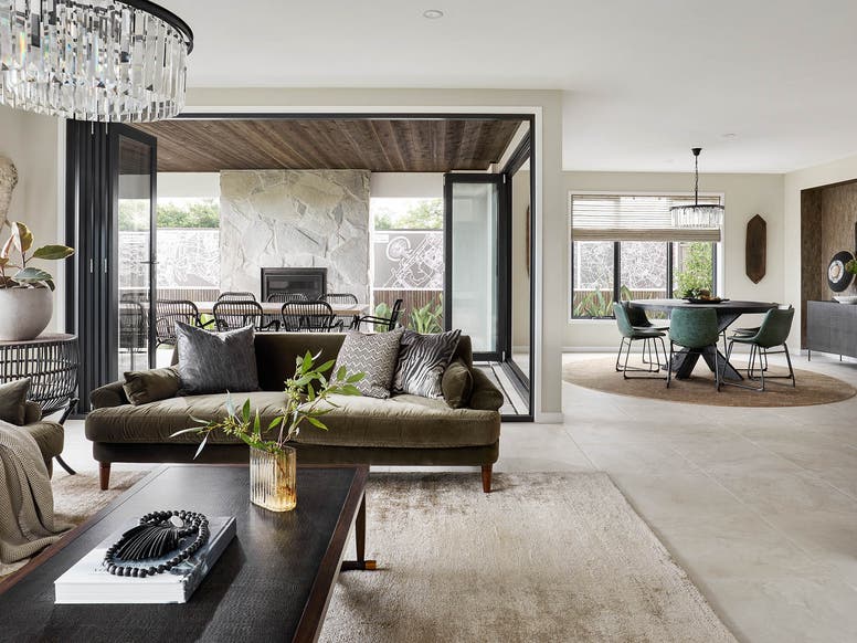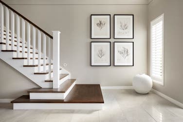 The Palace 33 with Lincoln façade in Berwick showcases a Vic ash staircase and glass balustrade to first floor, laundry cabinetry fit-out, timber windows to front façade, aluminium bi-fold doors to alfresco, full height windows to living and dining and square set plaster cornice to living and entry.