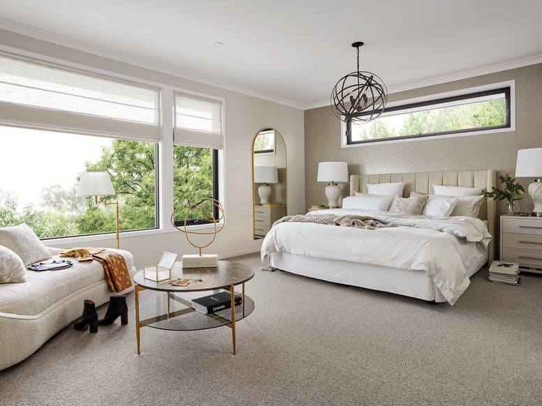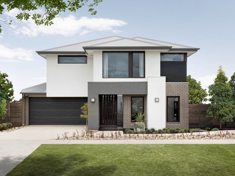 The Sahara 40 with Bass façade in Lara showcases a grand alfresco, ceiling height increase to first floor, freestanding bath to ensuite, dressing fitout, glass balustrade on staircase and bi-fold doors to the alfresco.